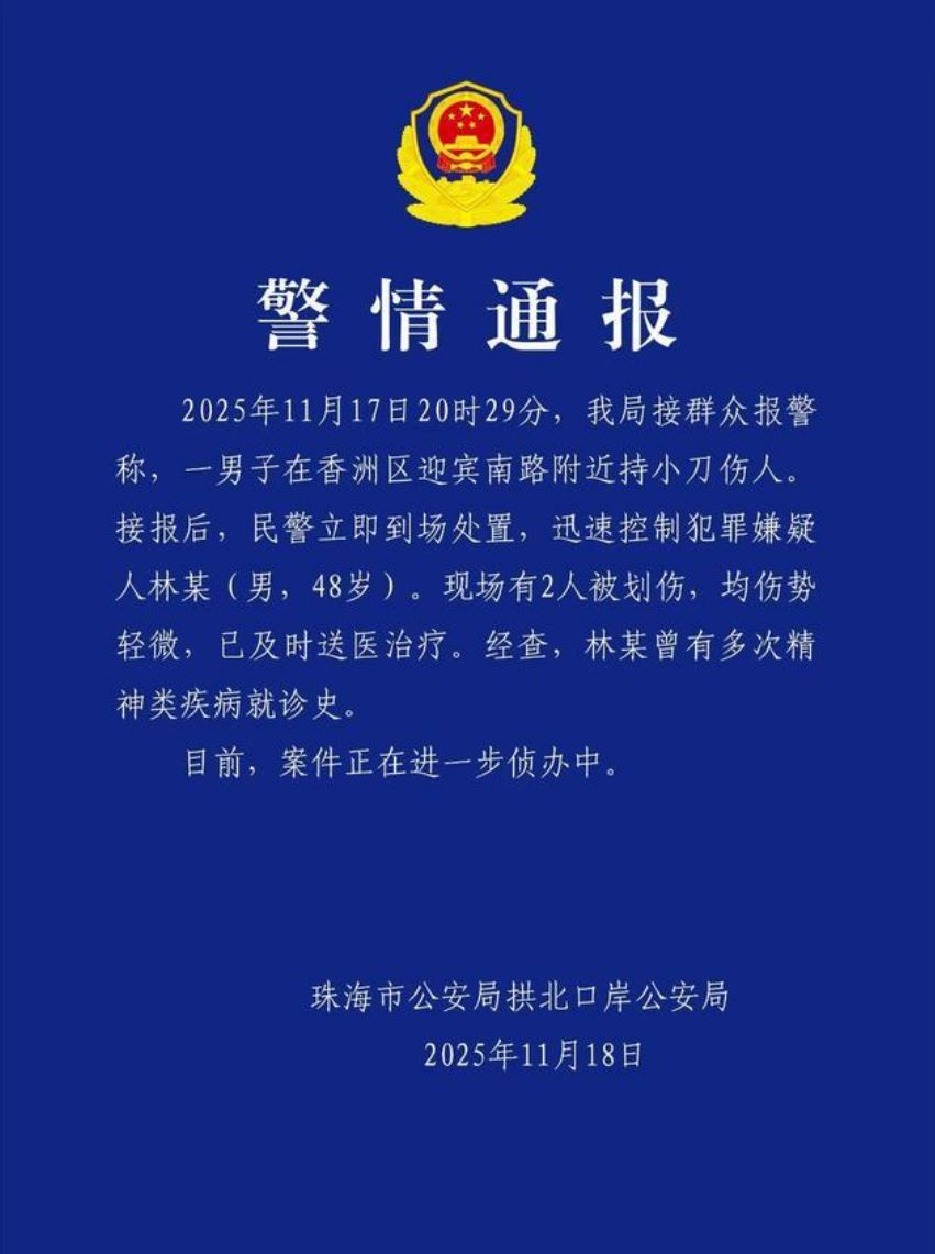A man with a history of mental health treatment was arrested after injuring two people in a knife incident near Gongbei Port in Zhuhai.