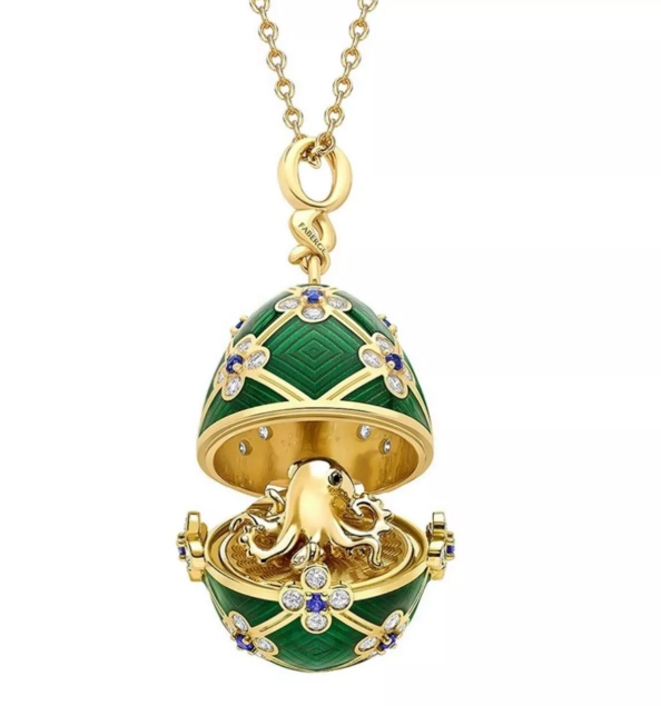 The pendant, part of a collection of only 50 pieces, is made of gold, decorated with green enamel, 183 diamonds, two sapphires, and features an 18-carat gold octopus inside.