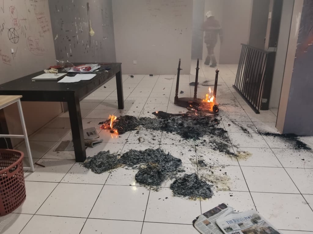 Bomba contained a table fire in Kuching, Malaysia, early Friday. The fire did not spread to the house, and a makeshift altar with pentagrams drawn on the wall and floor nearby suggested possible occult activity.