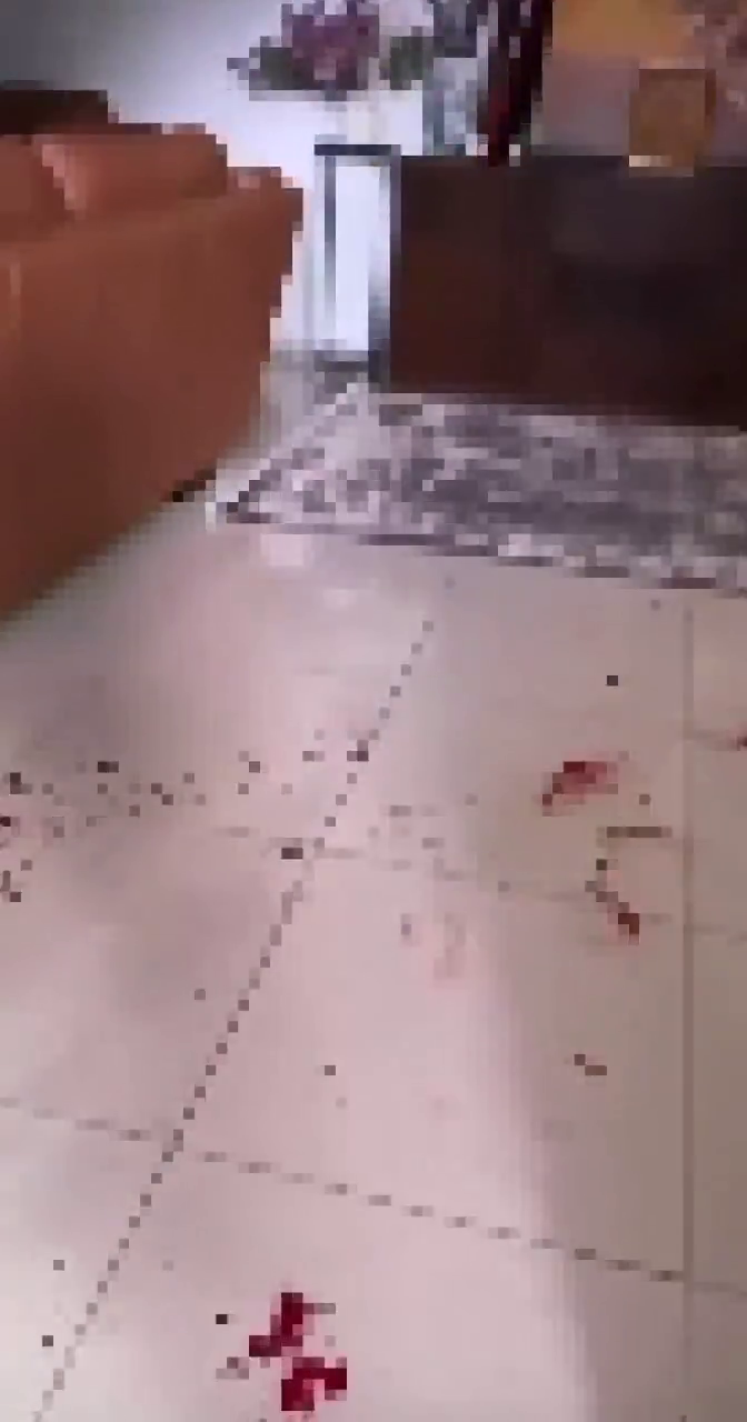 Images from the scene show bloodstains on the kitchen walls and floor, with multiple officers present conducting their inquiries.