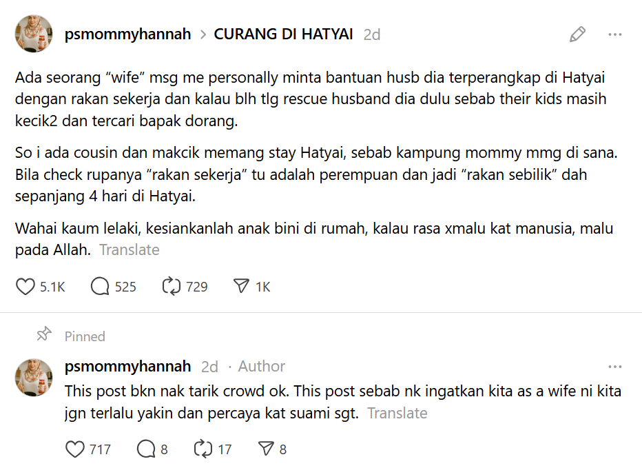 The woman, known as Mommy Hannah on Threads, had travelled from Bangkok to Hat Yai by train on 22 November. After being picked up by her brother, she returned to Kedah through the Durian Burung border following warnings about worsening floods in southern Thailand.
