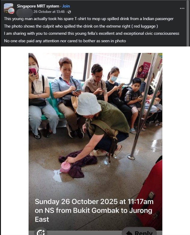 - A man used his own spare T-shirt to clean up a drink spilt by another passenger on an MRT train, earning widespread praise online.