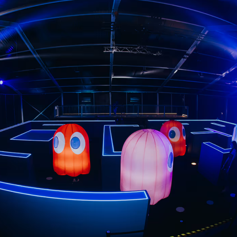 Participants navigate the familiar maze on foot, reenacting the arcade-style chase in real time, while designated viewing areas allow other visitors to observe the action.