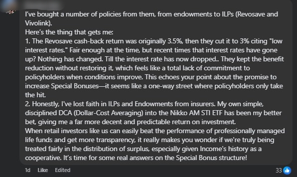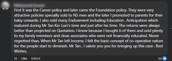 Comments on Tan’s Facebook post showed frustration and nostalgia among long-time policyholders. Some recalled that earlier policies under Tan Kin Lian’s leadership offered strong returns and upheld a cooperative spirit.