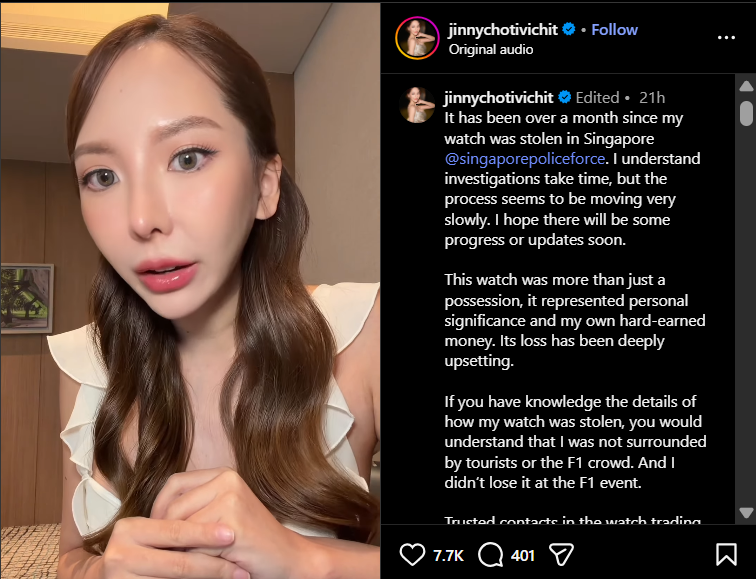 Thai influencer Jinny Chotivichit reported that her S$400,000 Richard Mille watch was stolen while she was in Singapore for the F1 event. She said the suspect has been arrested but the watch has not yet been recovered. Her remarks questioning Singapore’s safety have sparked mixed reactions online, with some expressing concern and others defending the country’s security record.