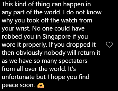 “If you have knowledge of the details of how my watch was stolen, you would understand that I was not surrounded by tourists or the F1 crowd. And I didn’t lose it at the F1 event,” she wrote in her Instagram caption.