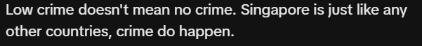 Another said: “Low crime doesn’t mean no crime. Singapore is just like any other country — crimes do happen.”
