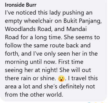 The unusual sight prompted a flurry of comments. One viewer said they had seen the same woman many times in daylight hours, usually pushing what appeared to be an empty wheelchair along Bukit Panjang, Woodlands Road, and Mandai Road.