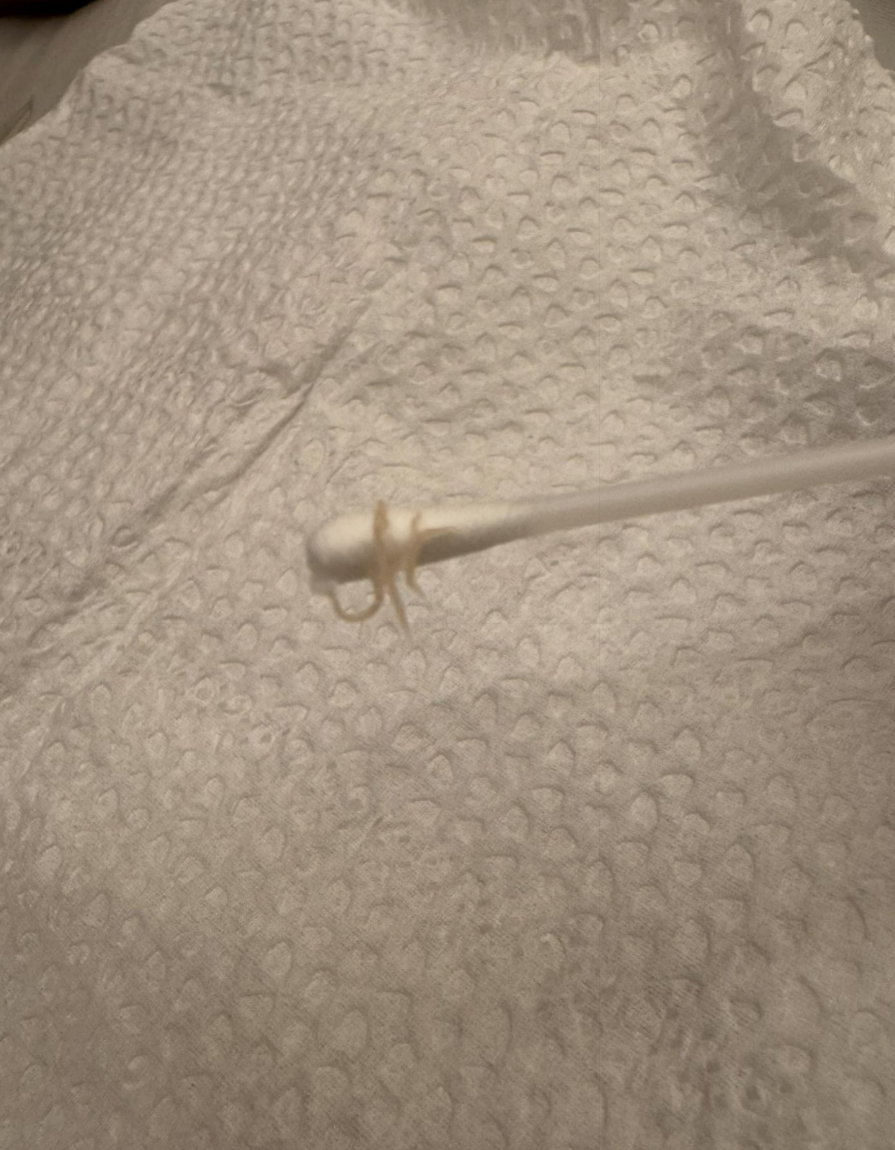 Using a cotton swab, she removed them and confirmed they were pinworms, a very common intestinal parasite among young children.